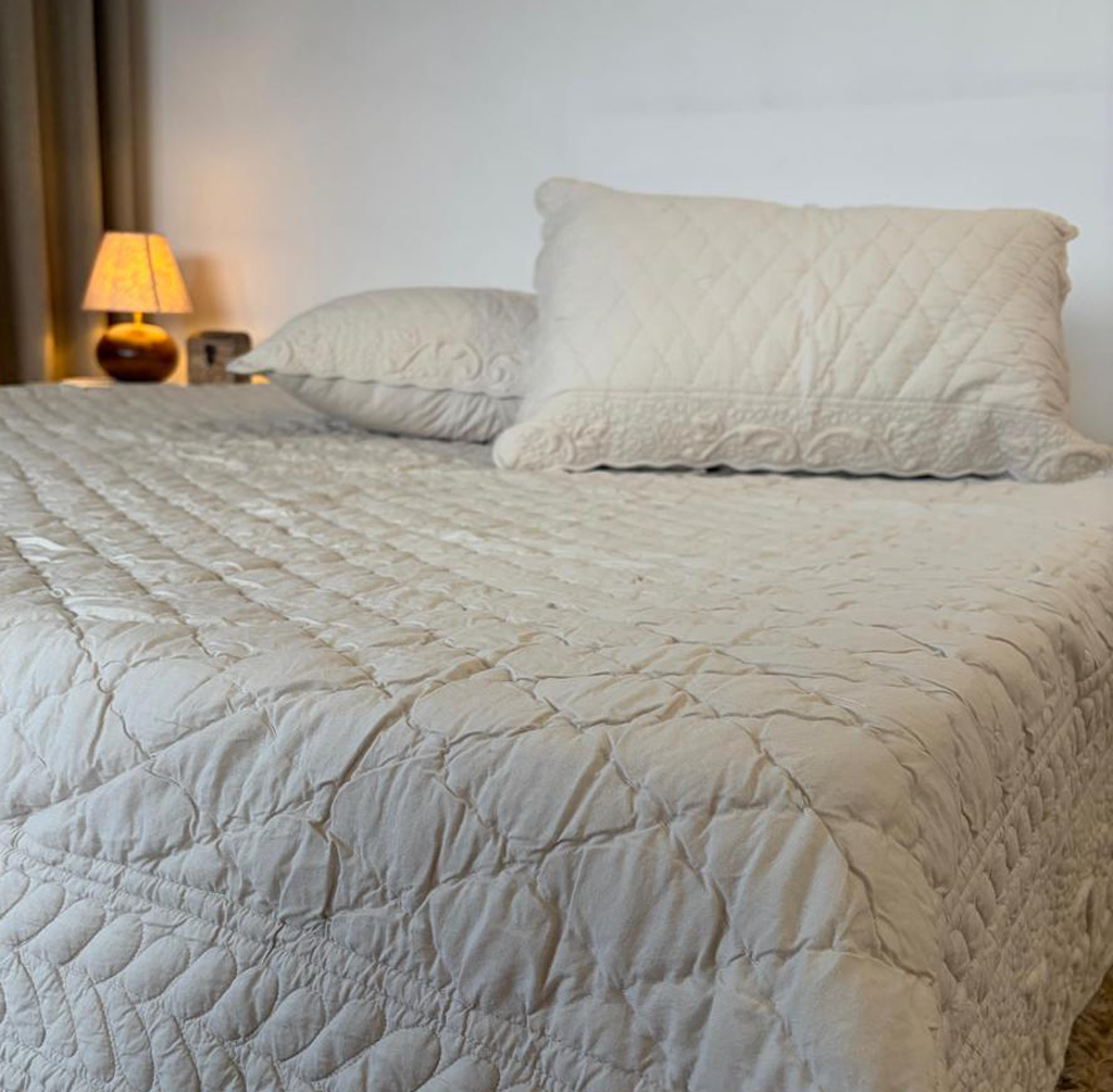 Rajvilasa Ivory Cotton Embossed Quilting Bedspread (2 rectangular cushions – embossed quilting border)
